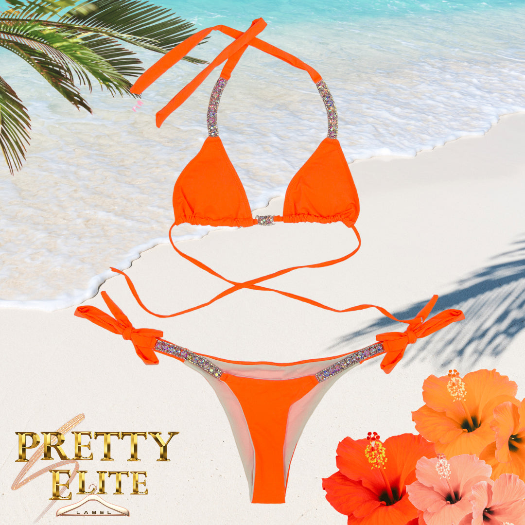 Bring all the heat this summer season with this vibrant neon-orange thong bikini set featuring: